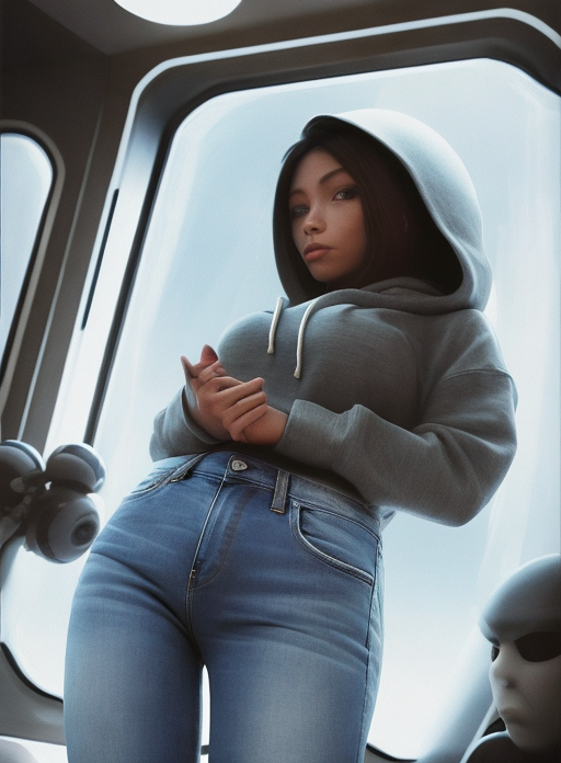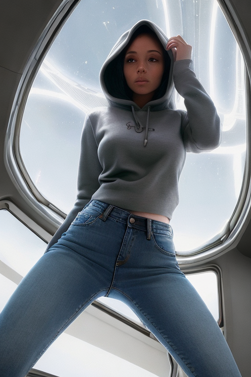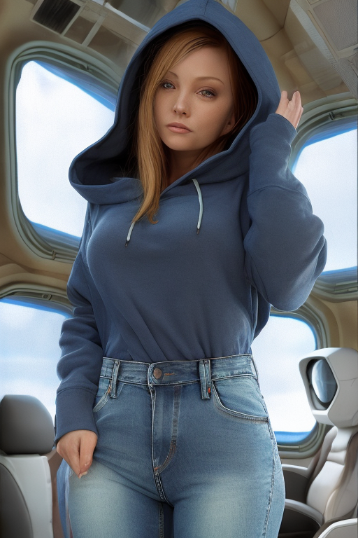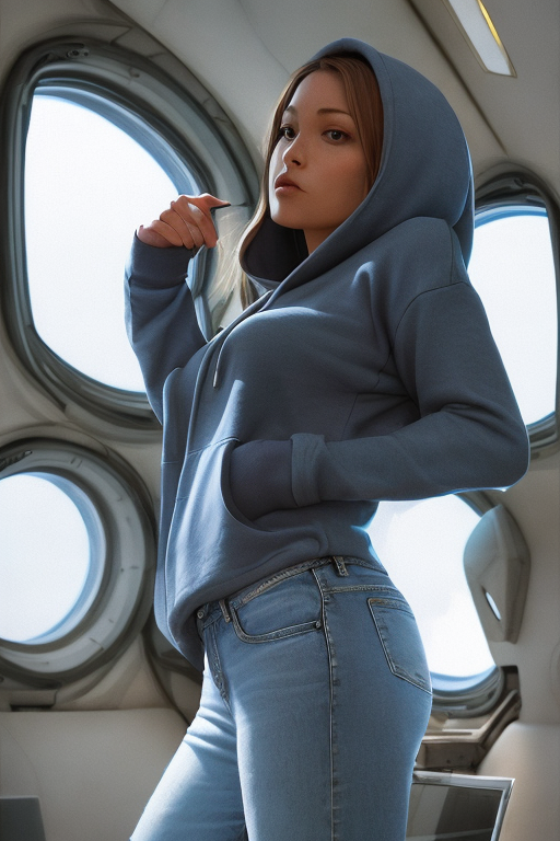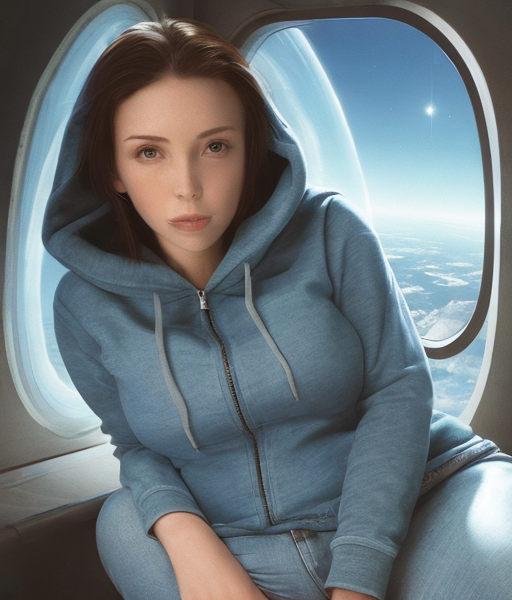 예를 들어, 동일한 설정과 동일한 프롬프트(woman, hoodies, jeans in a spaceship with windows overlooking a planet)를 사용하여(씨드 번호는 각각 3869045693,793903308) 아래와 같은 2개의 이미지를 얻었습니다.