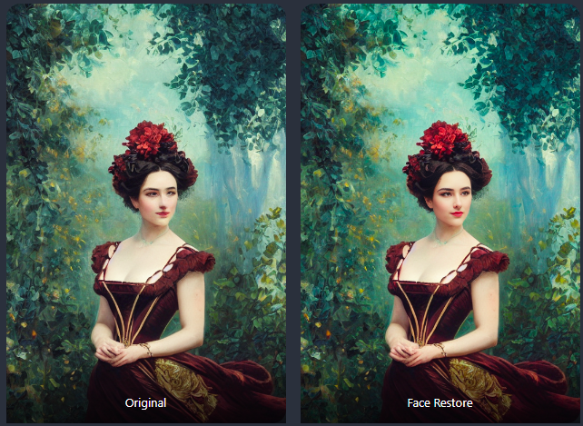 그 다음 txt2img 탭에 돌아와, "Resotre Faces"를 켜면, 그 다음부터 생성되는 이미지에는 얼굴 복원 기능이 적용됩니다. 제가 직접 예를 들어 해보려는데, 얼굴이 뒤틀어지는 경우가 별로 없어서... 요즘은 잘 되는 건지, 제가 사용하는 ChilloutMix 모델은 얼굴이 잘 생성되는지 잘 모르겠네요.