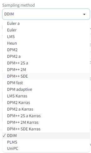 - 샘플링 방법(Sampling Method) : 대략적으로 이야기하면, 그림 생성형 인공지능은 잡음을 생성한 후, 프롬프트에 입력된 내용을 참고하여 잡음을 없애가는 과정으로 진행됩니다. 샘플링 방법은 이렇게 잡음을 제거하는 알고리듬을 이용합니다. 알고리듬에 따라 그림이 생성되는 속도도 다르고, 생성되는 결과도 달라지게 됩니다. 샘플링 방법은 아래와 같이 여러가지가 있는데, 저는 Easy Diffusion에서 기본으로 설정되어 있고, 속도도 빠르다고 한 DDIM을 기본으로 사용합니다. 이 글을 보면, 아주 다양한 샘플링 알고리듬의 효과를 볼 수 있는데, 저는 솔직히 그다지 차이를 잘 모르겠습니다.