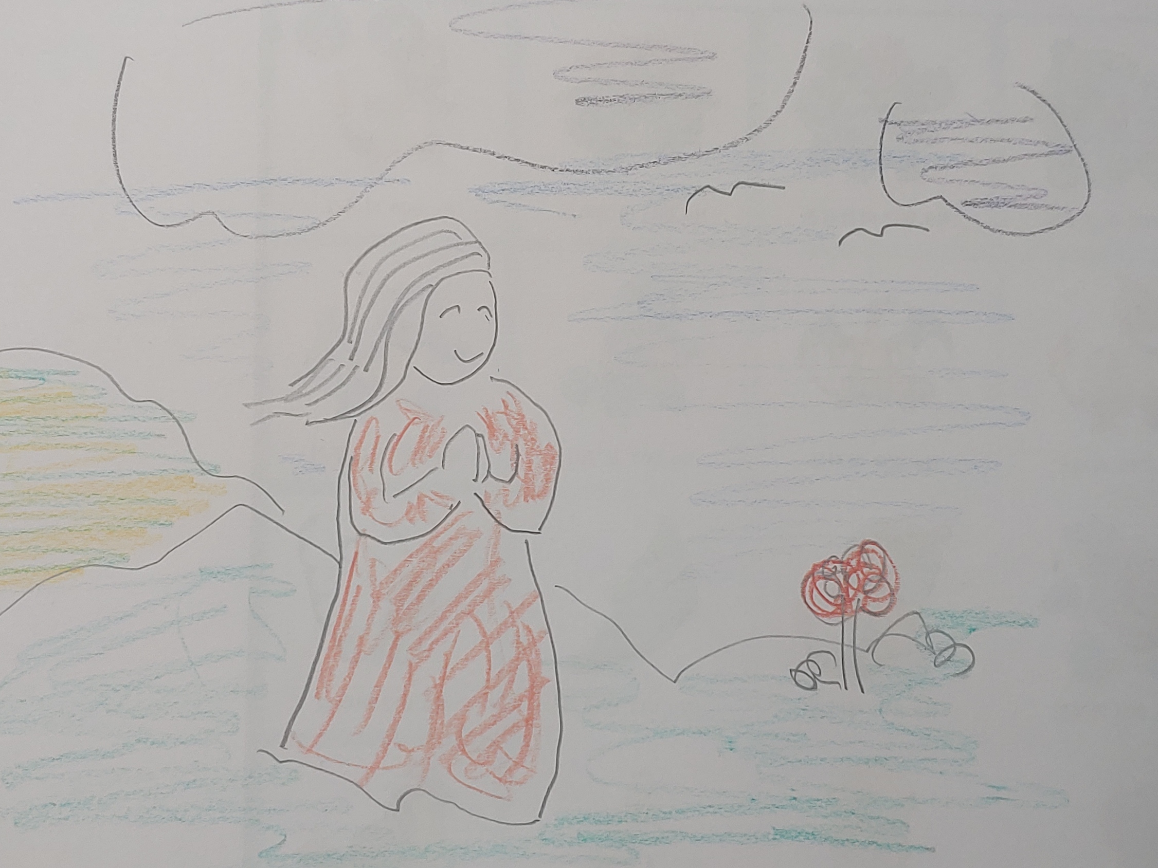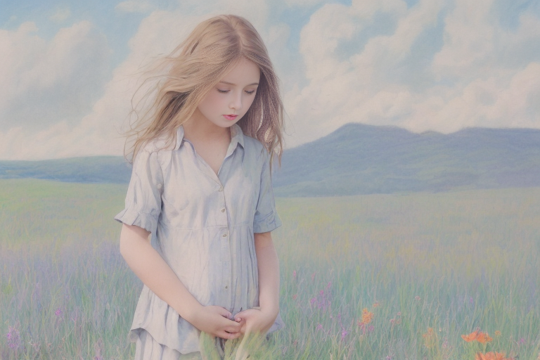하지만 마우스로 그림을 그리기는 쉽지 않죠. 그냥 색연필로 대충 그린다음에 원하는 것을 프롬프트로 지시해 주는 게 훨씬 나을 수 있습니다. 아래 왼쪽은 제가 그린 그림(이게 그림인가...ㅠ)이고, 이를 사용해서 Stable Diffusion에서 생성한 그림입니다. 프롬프트는 "a color pencil sketch of girl in grassland, standing pose, praying, clasp hands on the chest, facing right, look into the distance, flowers, blue sky with clouds, small hill in the background, photorealistic, masterpiece"