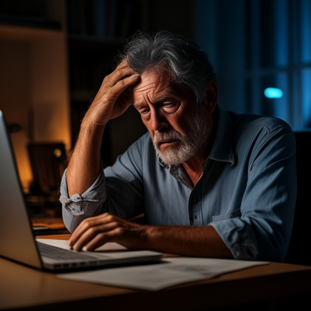 아래는 결과물입니다. 프롬프트는 "A man in his fifties, pulling his hair late into the night, diligently crafting a report in front of the computer" (밤 늦도록 머리를 쥐어뜯으며 컴퓨터 앞에서 보고서를 작성하는 50대 남자) 입니다. 흠... 제법 잘 나오네요.