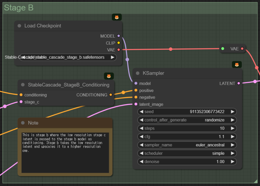 그런데, 어디를 봐도 Stage A에 해당하는 모델을 불러들이는 곳이 없습니다. 이것은 바로 위의 노드에서 출력으로 VAE가 있는데, 즉, "stable_cascade_stage_b.safetensors" 모델 내에 VAE에 해당하는 stage_a 모델이 포함되어 있기 때문입니다.