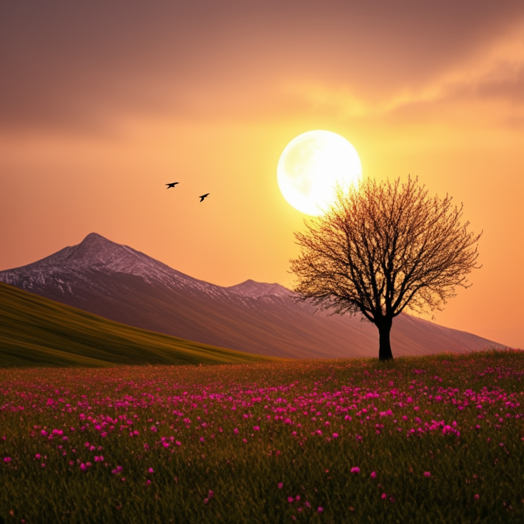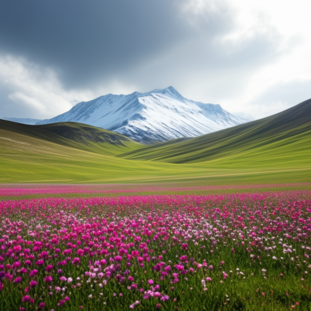 이 워크플로는 아얘 프롬프트 없이도 사용할 수 있습니다. 그러면 입력된 이미지와 전반적으로 분위기가 비슷한 이미지가 생성되죠. 아래는 그 결과입니다. 전경에는 분홍색 꽃밭, 배경에는 설산. 입력된 이미지와 상당히 비슷함을 알 수 있습니다.