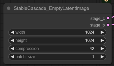 맨 아래에는 있는 [StableCascade_EmptyLatentImage] 노드만 기본 워크플로에서 사용되지 않는 노드입니다. 모양은, [EmptyLatentImage]노드와 거의 비슷하게 생겼죠. "compression" 위젯이 하나 추가되어 있고 (압축률이 42이라는 뜻입니다. 그다지 건드릴 일이 없을 듯합니다), 각각 stage_c와 stage_b의 latent_image와 연결되는 출력이 2개 있는게 특이합니다.