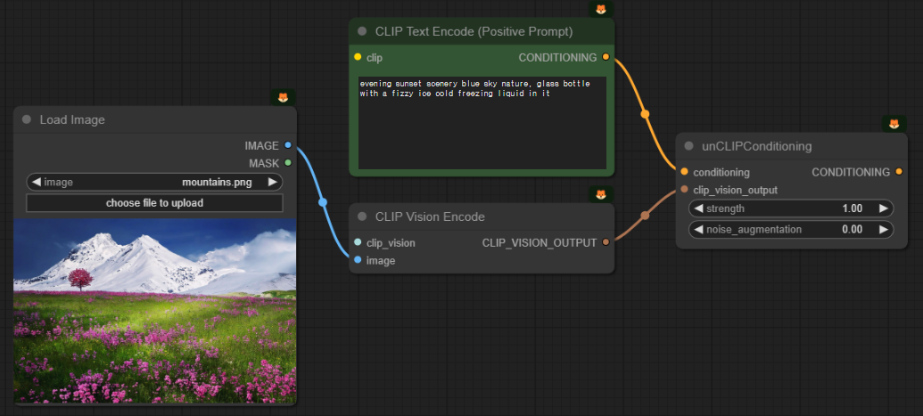 여기에서는 [CLIP Vision Encode]노드로 이미지를 해석해서 그것을 텍스트 프롬프트와 합쳐서 조건부여(conditioning)으로 사용한다는 점입니다.