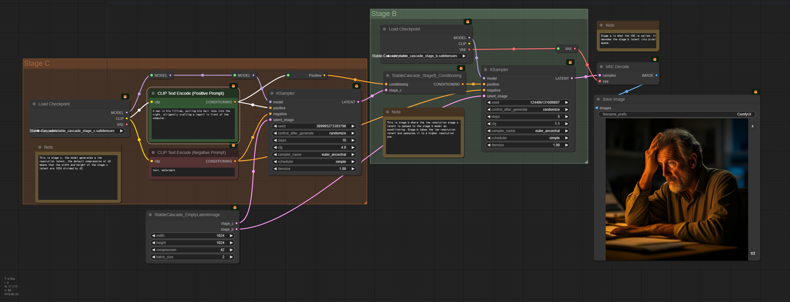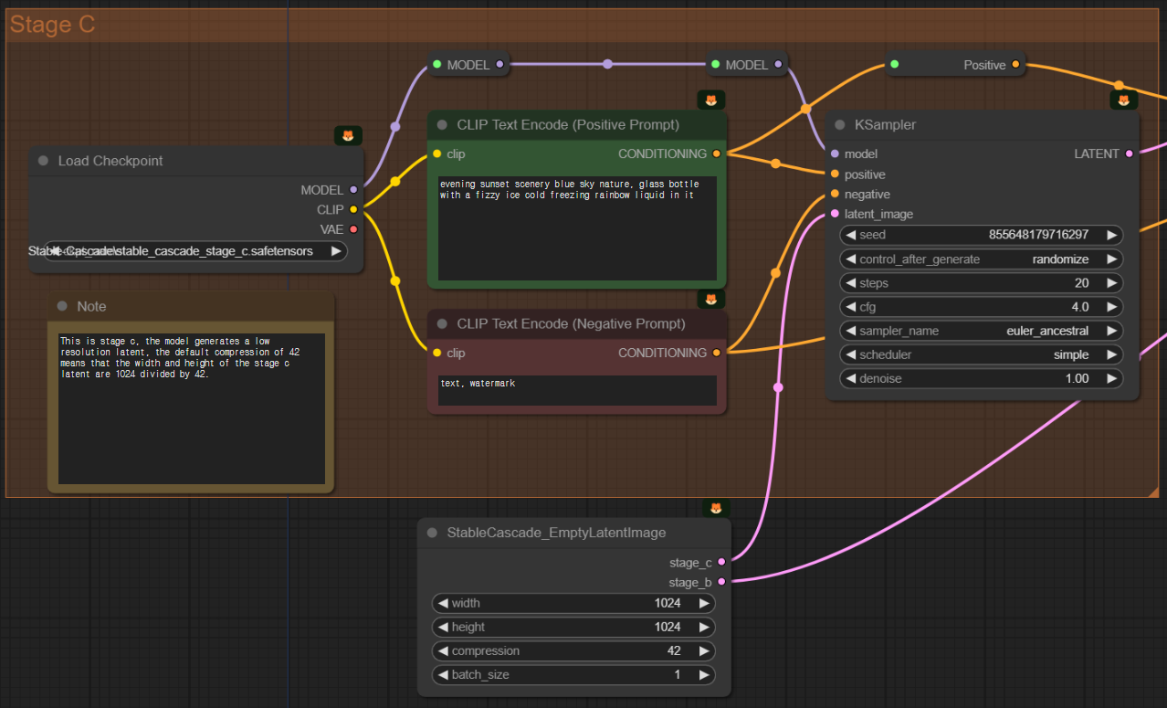 아래는 가장 간단한 txt2img 워크플로입니다. 참고로 이 워크플로는 ComfyUI_exsamples 사이트에 있는 워크플로를 약간 변형한 것입니다. 특히 스테이지 C의 샘플링 단계를 20에서 10으로, 스테이지 B의 샘플링 단계를 10에서 5로 낮췄으니 참고하세요.