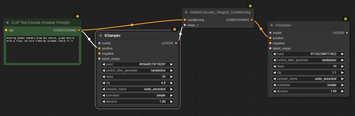 그리고 여기에도 [Load Checkpoint] 노드가 하나 더 있는데, 당연히 "stable_cascade_stage_b.safetensors" 모델을 불러들이고, 모델은 [KSampler]로 연결됩니다.