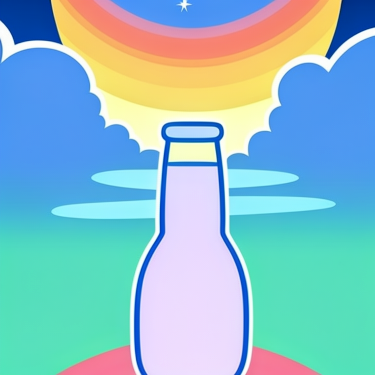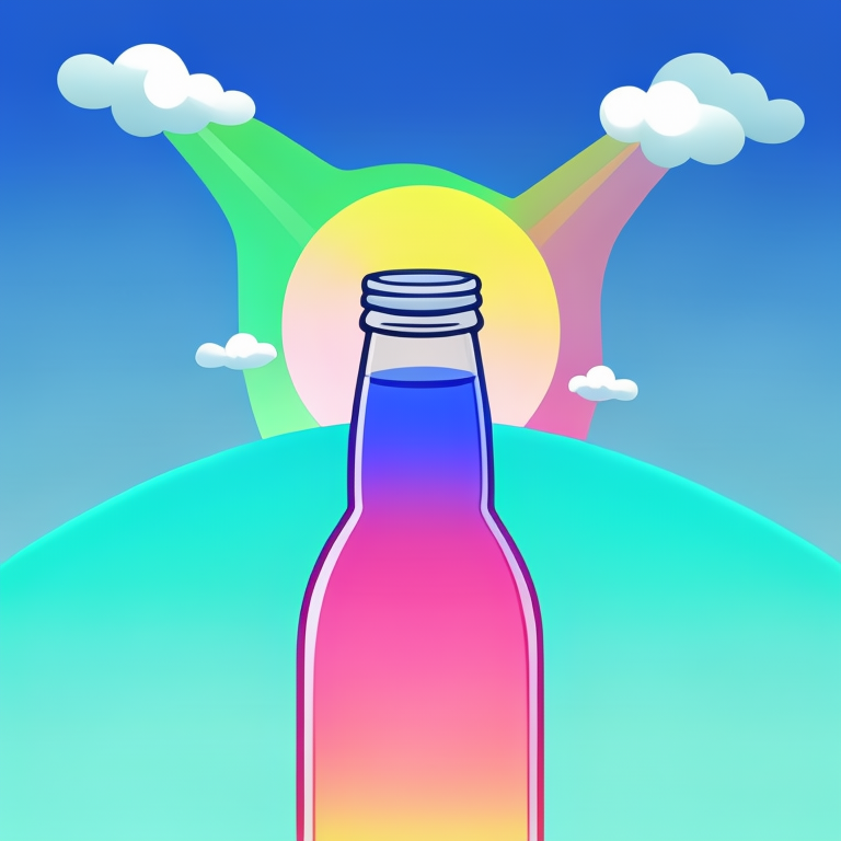 아래는 결과 이미지 입니다. 프롬프트는 "evening sunset scenery blue sky nature, glass bottle with a fizzy ice cold freezing rainbow liquid in it" 입니다.