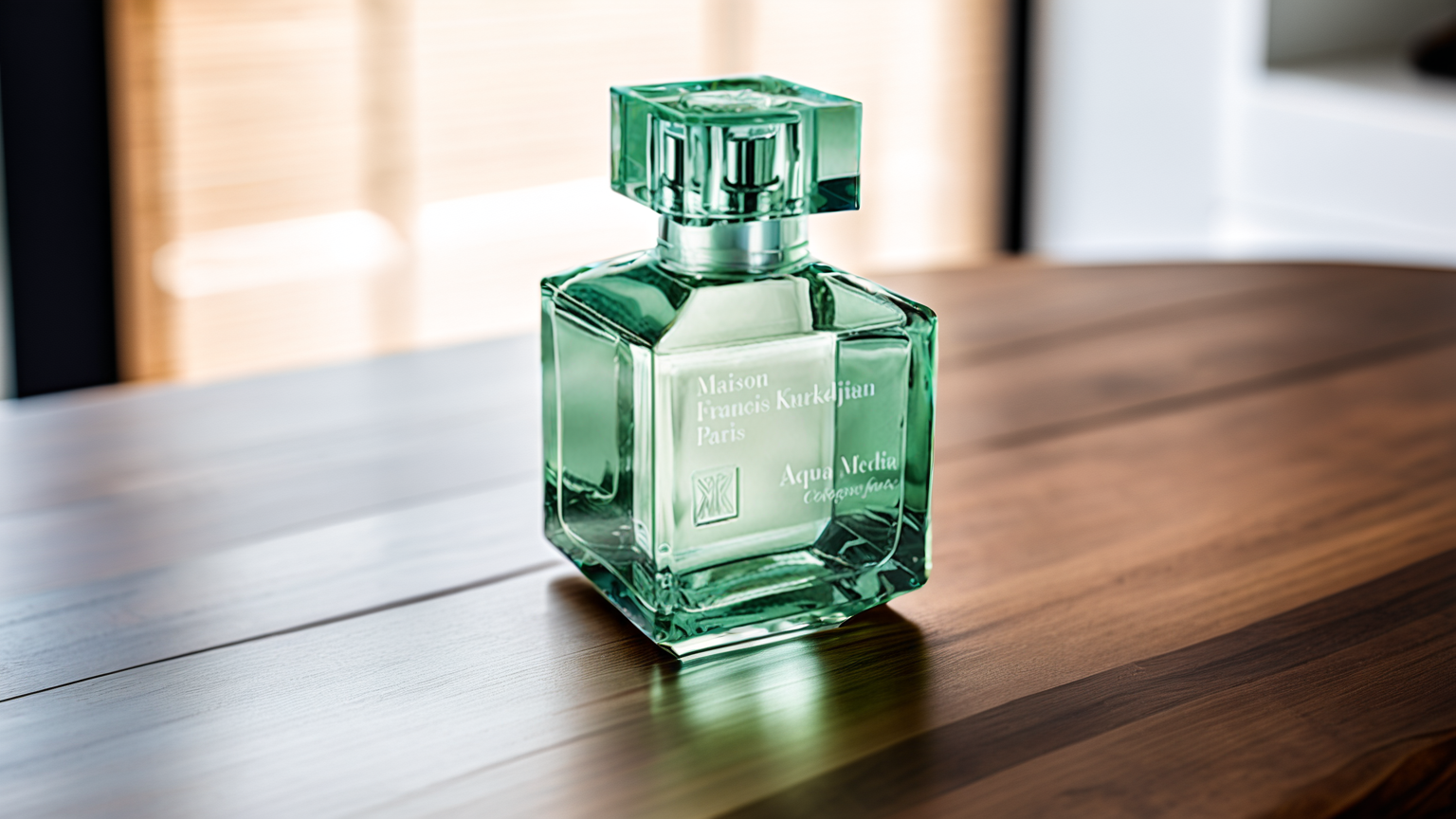 프롬프트: product photo of a perfume bottle on wooden expensive table, modern house background