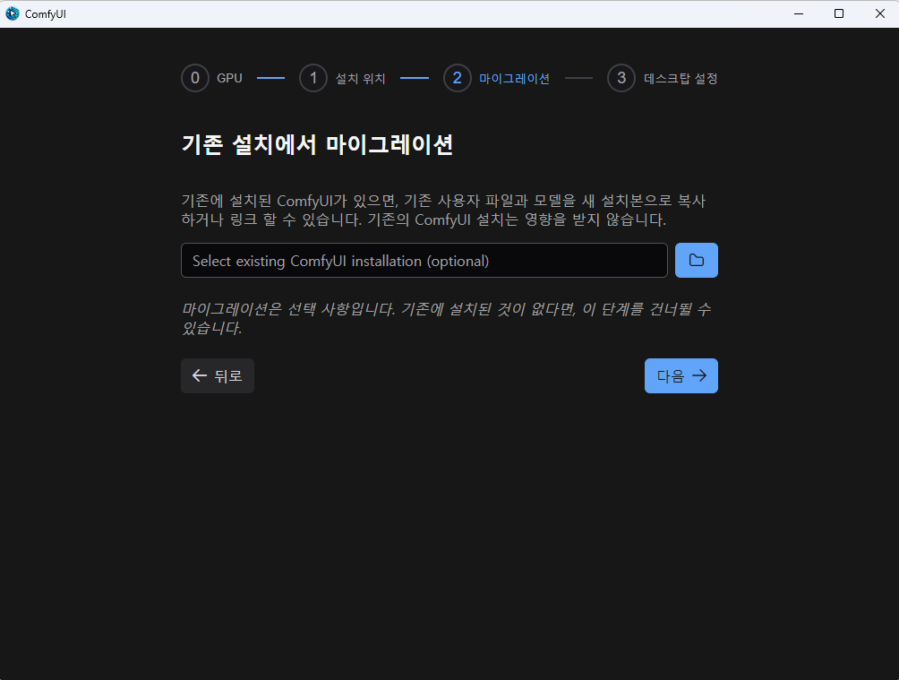 다음으로 기존에 설치하였을 경우, 그 설치에 설정한 환경을 가져오는 옵션입니다. 웹UI 버전의 ComfyUI가 설치된 위치를 지정하면 됩니다. 그런데, 저는 아무리해도 안되네요. 그래서 그냥 다음 버튼을 눌렀습니다. 설명을 보니 사용자 파일이나 모델을 링크로 지정하고 커스톰노드는 동일한 내용을 새로 설치해주는 모양입니다.