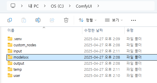 우선 ComfyUI 데스크탑이 설치된 위치에 들어가, models 폴더를 삭제하거나 다른 이름으로 바꿔줍니다.