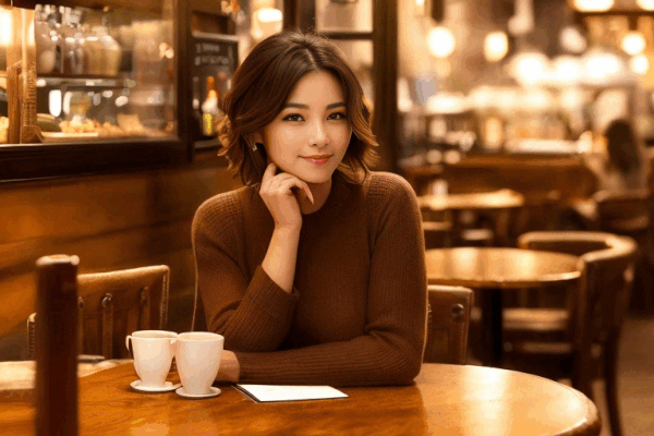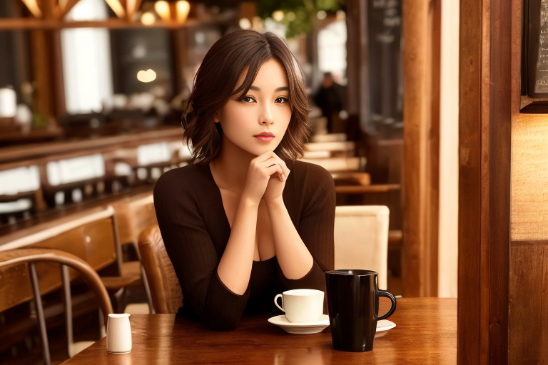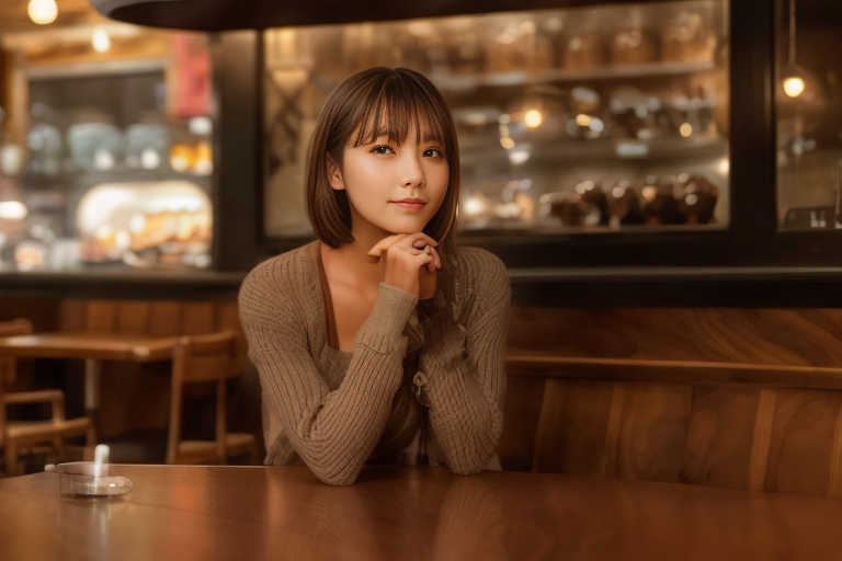 프롬프트 : a beautiful woman sitting at a table, brown eyes, looking at me, atmospheric cafe,