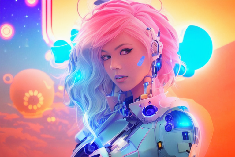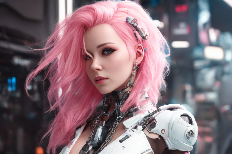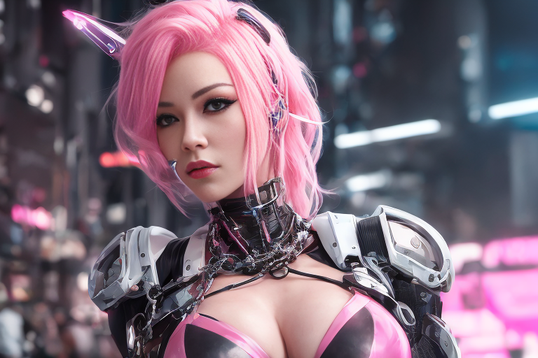 프롬프트: a woman with pink hair and a futuristic suit with chains on her head and a sci - fi filament on her face, Artgerm, cyberpunk style, cyberpunk art, retrofuturism