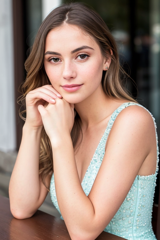 프롬프트: photo of young woman, highlight hair, sitting outside restaurant, wearing dress, rim lighting, studio lighting, looking at the camera, dslr, ultra quality, sharp focus, tack sharp, dof, film grain, Fujifilm XT3, crystal clear, 8K UHD, highly detailed glossy eyes, high detailed skin, skin pores