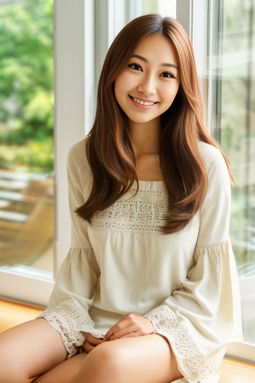 프롬프트 : half-body, a beautiful woman, brown eyes, sitting beside windows, smile, small breast