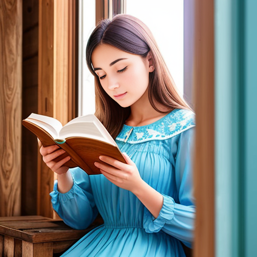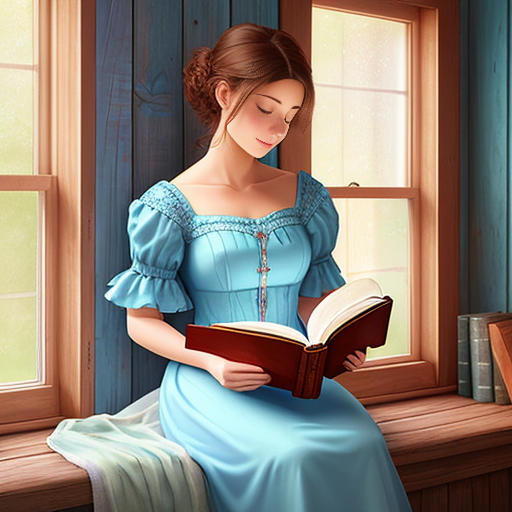 프롬프트: Digital painting of a young woman with light blue dress sitting next to a wooden window reading a book