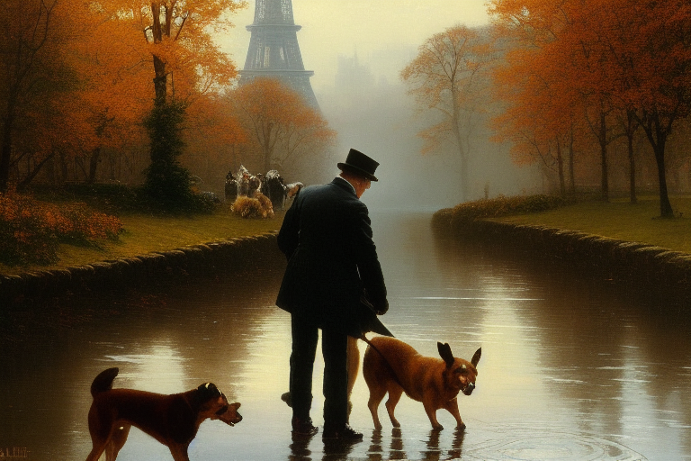 dog, autumn in paris, ornate, beautiful, atmosphere, vibe, mist, smoke, fire, chimney, rain, wet, pristine, puddles, melting, dripping, snow, creek, lush, ice, bridge, forest, roses, flowers, by stanley artgerm lau, greg rutkowski, thomas kindkade, alphonse mucha, loish, norman rockwell.