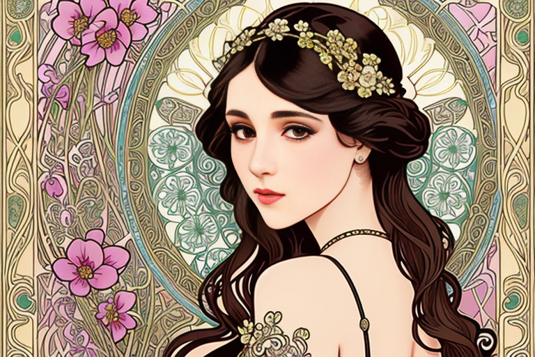 | A young woman adorned with flower motifs in a graphic inspired by the style of Alphonse Mucha. Intricate linework and decorative elements bring the artwork to life, capturing the elegance and grace of the Art Nouveau era (이 프롬프트도 ChatGPT를 활용해 작성했습니다.) | ||
