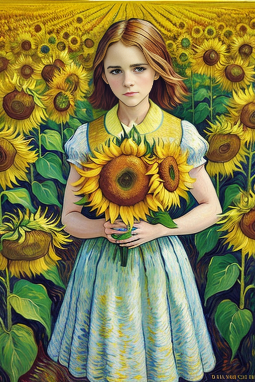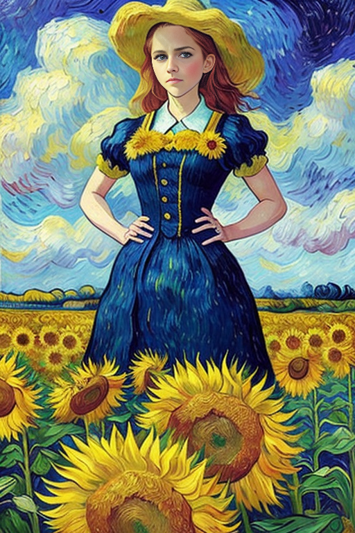 이게 뭐가 그렇게 대단한데? 이렇게 생각하실 수도 있습니다. 이정도의 이미지라면 구글에서 검색하면 수백만장 존재할 건데요. 하지만 이 기술이 흥미로운 점은, 모델내에 이전에는 존재하지 않았던 고품질의 이미지를 생산할 수 있다는 겁니다. 예를 들어 엠마 왓슨을 인상파 화가 고흐 스타일로 그려낼 수 있습니다. 아래는 " Vincent van Gogh-inspired oil painting of Emma Watson, standing in a sunflower field, vibrant brushstrokes, expressive color palette, capturing her essence with impasto technique, evoking emotion and movement on canvas" 라는 프롬프트를 사용해 생성한 이미지입니다.