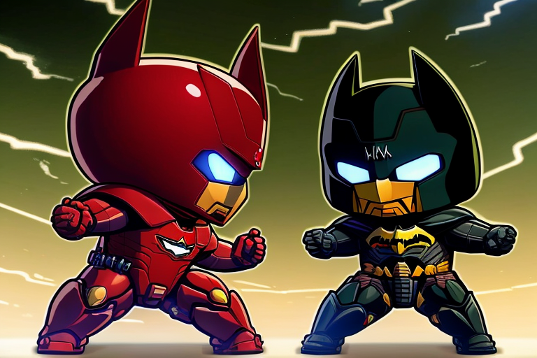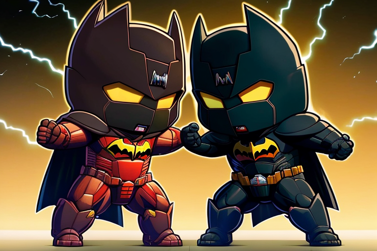 프롬프트 : masterpiece, batman and ironman fighting each other on a dark background with lightnings behind him, thick black outline <hypernet:sxzSmol_sxzSmol:1>